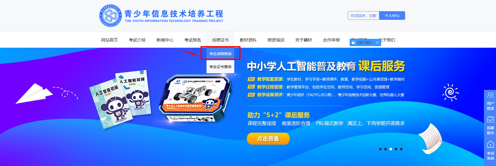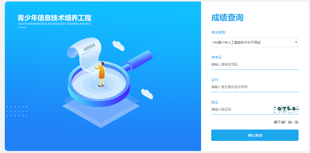 第2步,考试类型选择“YAI青少年人工智能技术水平测试”,输入准考证号码、身份证件号码和验证码,点击“确认查询”即可。