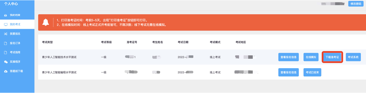 一、进入官网“个人中心”——“我的考试”,找到“下载准考证”,下载并打印即可。