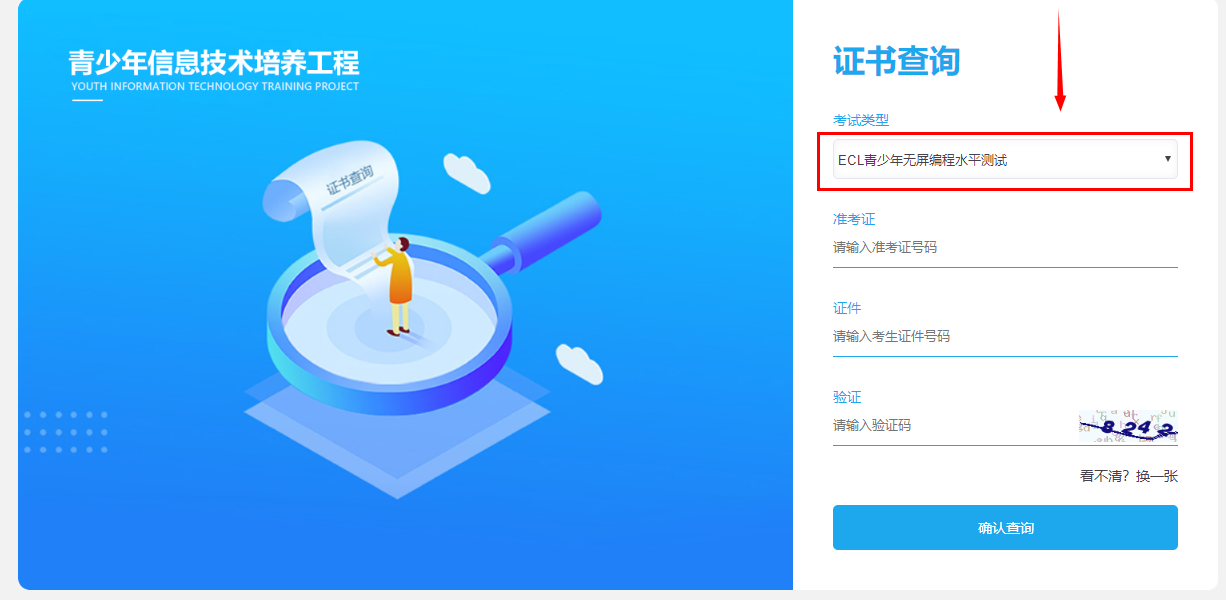 第2步,考试类型选择“ECL青少年无屏编程水平测试”,输入准考证号码、身份证件号码和验证码,点击“确认查询”即可。