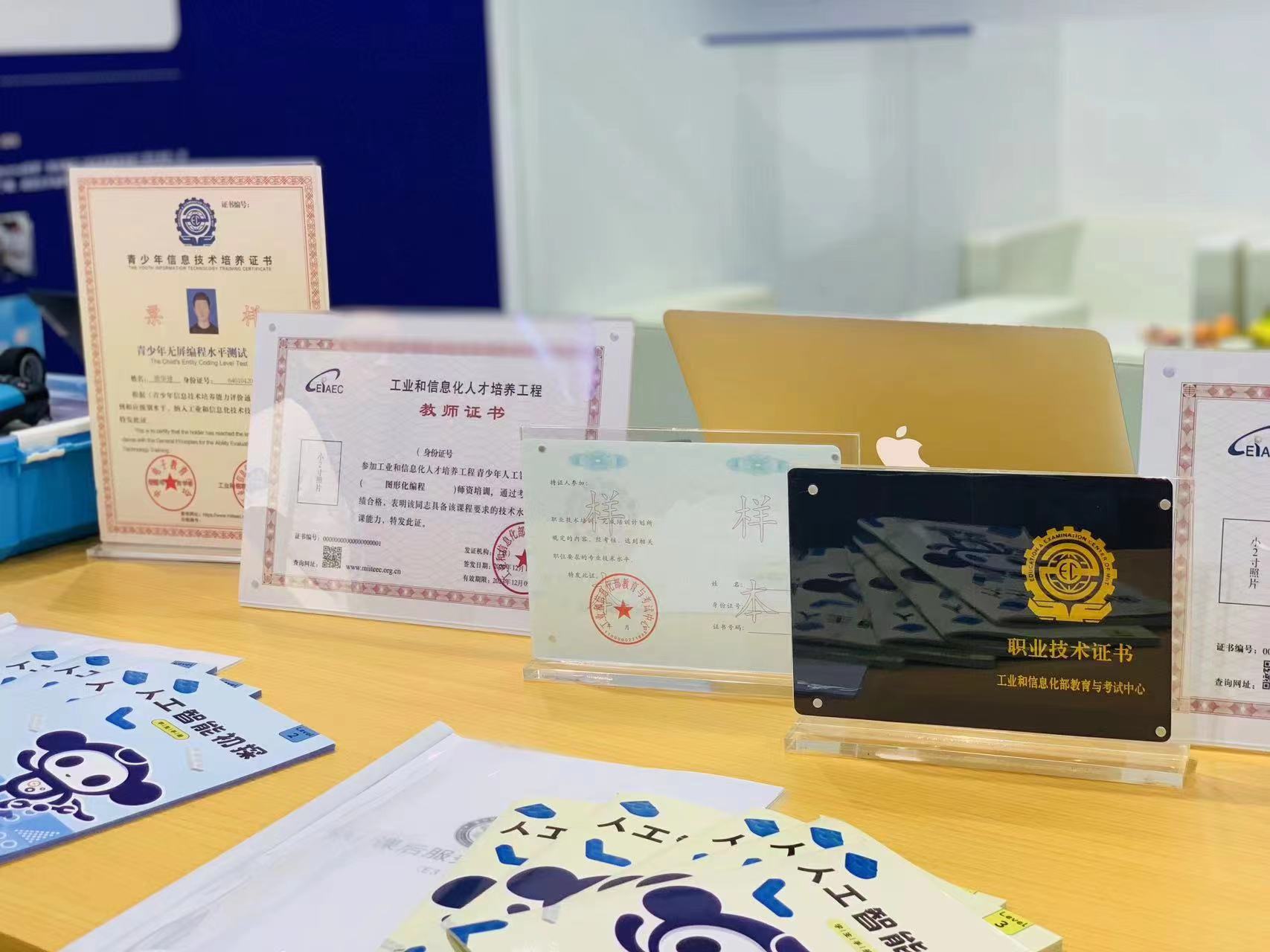 青少年信息技术培养工作站带来青少年人工智能等级测评、“工信学堂”中小学素质教育课后服务平台、青少年信息技术创新活动、世界机器人大赛——YAI赛项等项目及相关教材、器材、证书等参展。